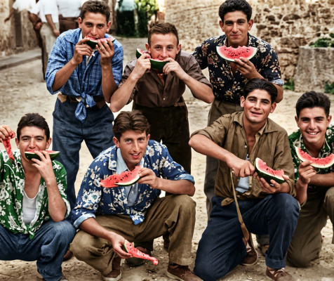 Los Divertidos" en el año 1958 con la primera blusa de su peña y comiendo sandía en la Placetilla.