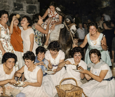 Fiestas de los años sesenta y esta cuadrilla va de ponchada, ya se disponen a probar la chistorra, el chorizo y otras viandas.